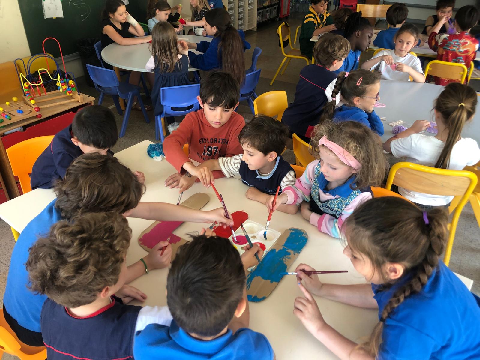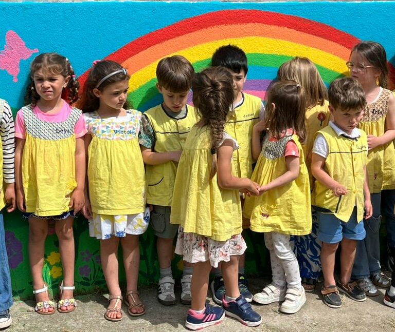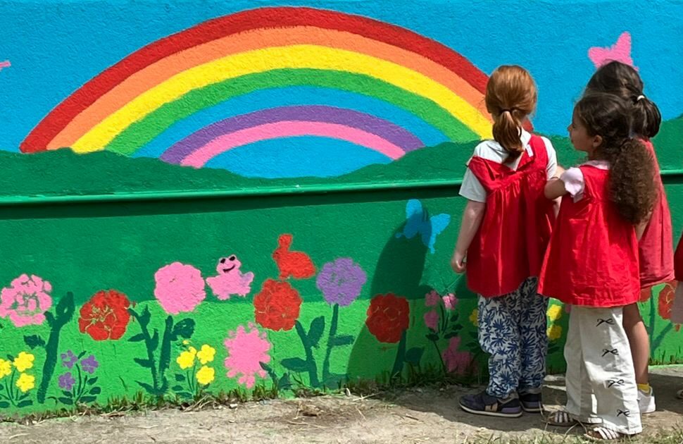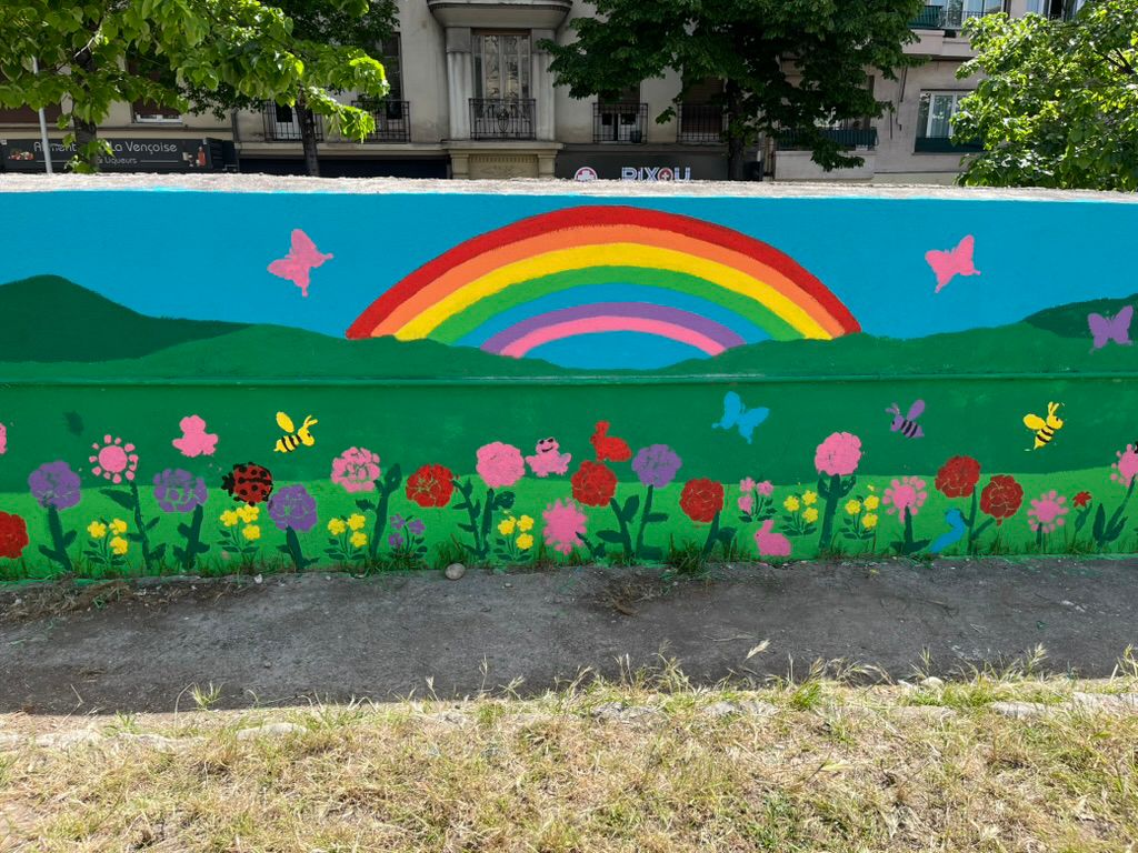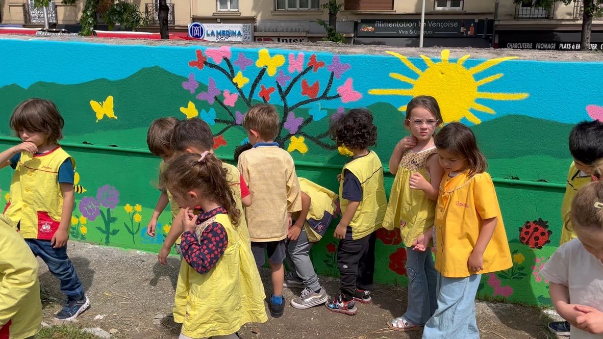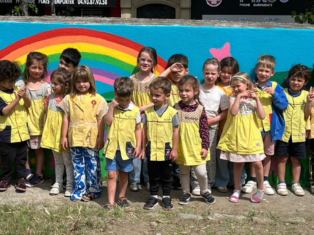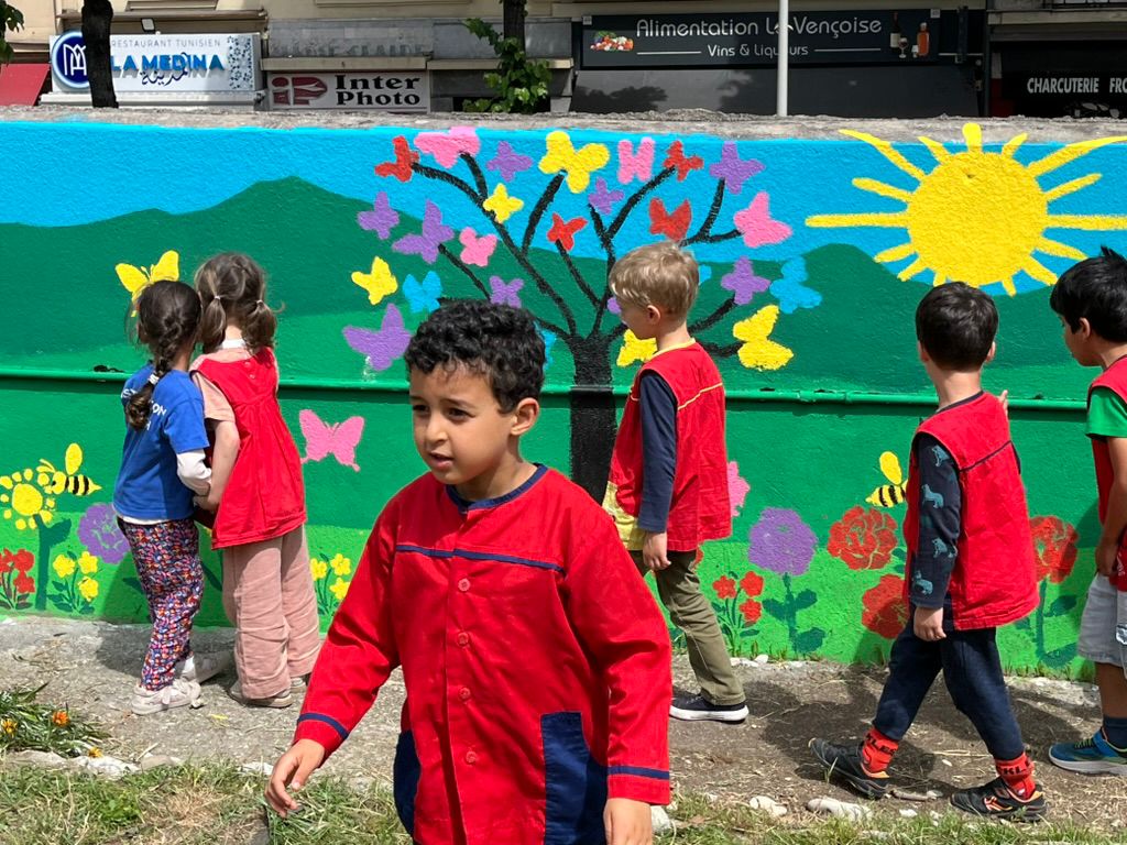 • Découverte de la fresque murale dans le jardin, que nous avons terminée avec l’aide des mamans de l’association des parents d’élèves.